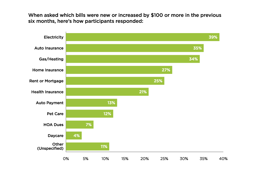 In a recent Experian survey, 58% of respondents noticed a significant jump in their monthly expenses.4 Many cited that these rising costs are impacting their ability to pay down their credit card balances. Here’s a breakdown of the bills that saw the biggest increases: