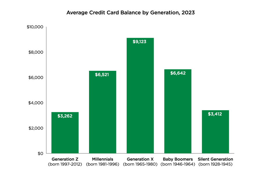 Here’s a quick look at the average credit card balances by generation in 2023: